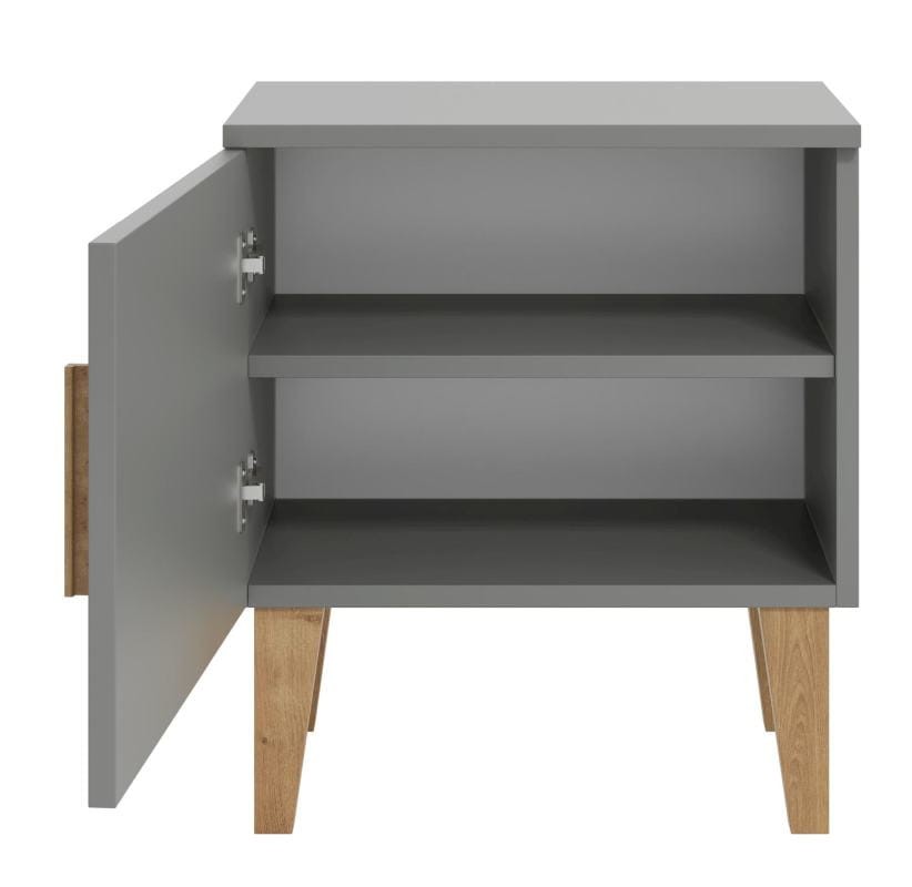 - Szafka nocna posiada cichy domyk montowany na klik. Wewnątrz posiada jedną półkę.