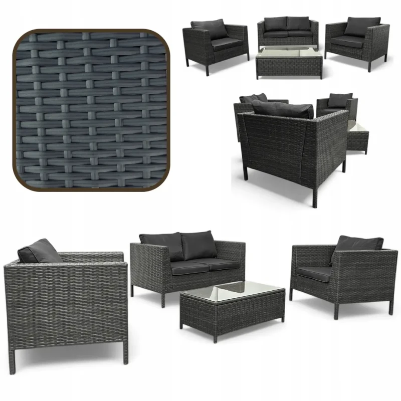 - Skład zestawu: 2 x fotele, 1 x sofa, 1 x stolik, poduszki