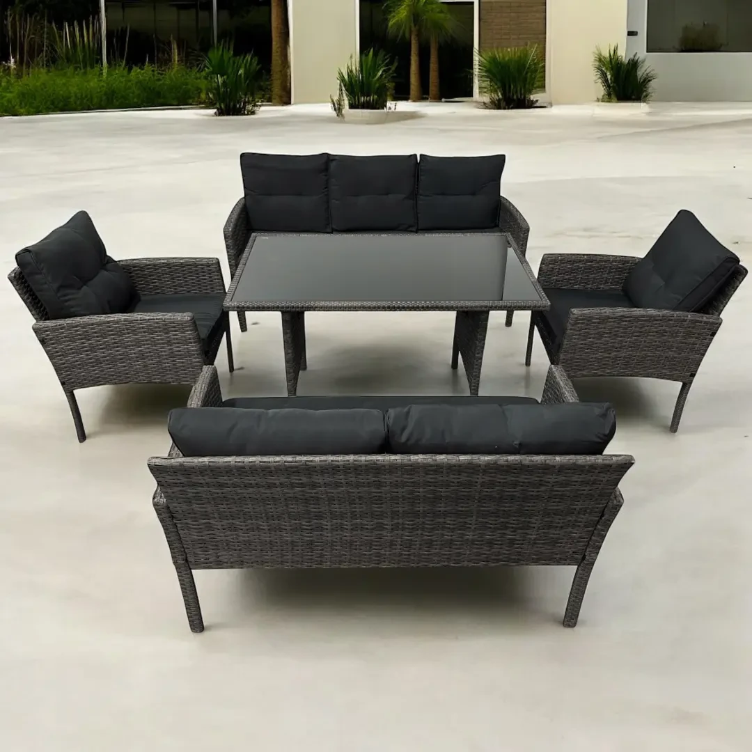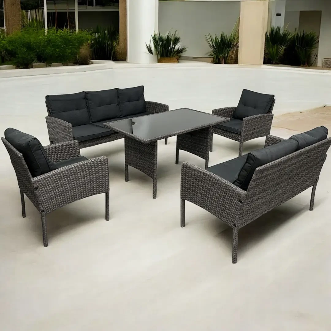 Zamień swój ogród lub taras w stylową strefę wypoczynku dzięki zestawowi Puertorico wykonanemu z eleganckiego technorattanu. Zestaw składa się z dwóch wygodnych foteli, przestronnej sofy trzyosobowej, sofy dwuosobowej oraz dużego prostokątnego, wysokiego stolika z eleganckim blatem z hartowanego szkła. Sofy i fotele zestawu wyposażone zostały w miękkie poduszki na siedziska i oparcia, które zapewniają nie tylko komfort, ale również stylowy wygląd. To nie tylko meble – to Twoje nowe ulubione miejsce do relaksu. Dzięki nowoczesnemu designowi, trwałym materiałom i komfortowym poduszkom, zestaw zapewnia idealne warunki do wypoczynku na świeżym powietrzu – niezależnie od pogody. Nieważne, czy planujesz rodzinne obiady, spotkania z przyjaciółmi, czy poranny rytuał z kawą i książką – Puertorico będzie Ci towarzyszył przez lata.