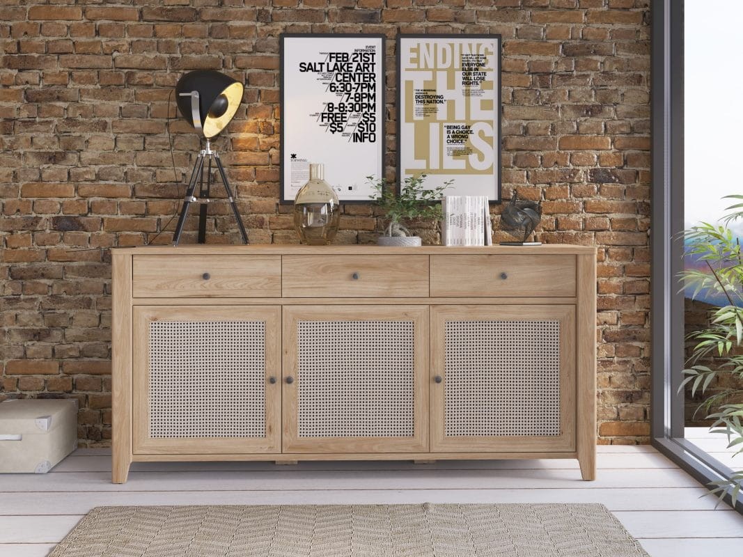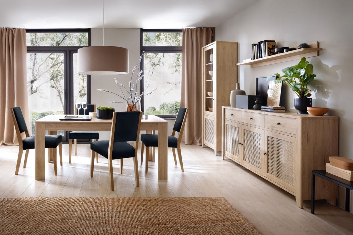 Zestaw mebli Parilla to stylowy i oryginalny set do jadalni w stylu boho. W zestawie znajdują się stół rozkładany, komoda z trzema szufladami, witryna z oświetleniem LED oraz półka wisząca. Korpus mebli wykonano z odpornej na uszkodzenia mechaniczne płyty laminowanej o grubości 16 mm, a fronty z wysokiej jakości płyty MDF, dzięki czemu zestaw zachowa swój atrakcyjny wygląd przez długi czas. Dodatkowym wizualnym atutem mebli z serii Parilla są fronty mdf z okleiną w postaci folii finisz amadeus. Prosty i minimalistyczny design sprawia, że zestaw świetnie sprawdzi się zarówno we wnętrzach naturalistycznych, skandynawskich jak i boho, gdzie królują oszczędność formy i naturalne, jasne kolory. Meble znajdą swoje miejsce zarówno w jadalni, jak i aneksie kuchennym.