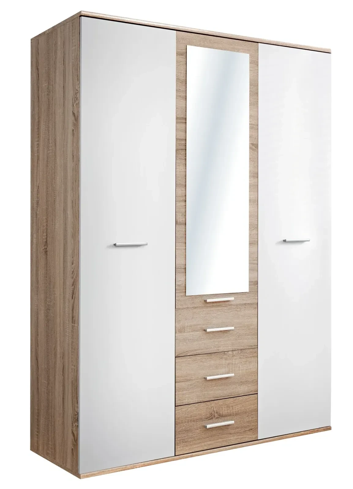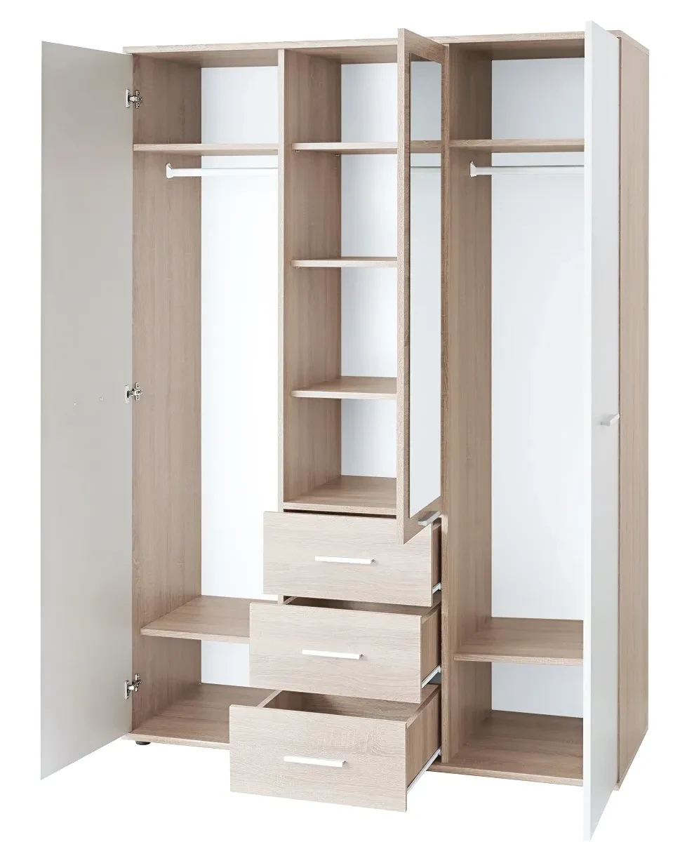 - 1 x szafa z 3 drzwiami (jedne drzwi z lustrem). W środku 3 półki i 3 szuflady. W bocznych częściach szafy po 2 półki i drążek