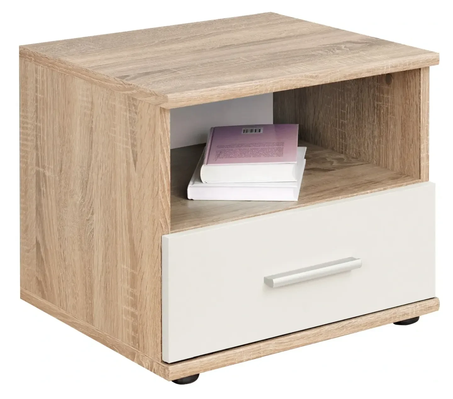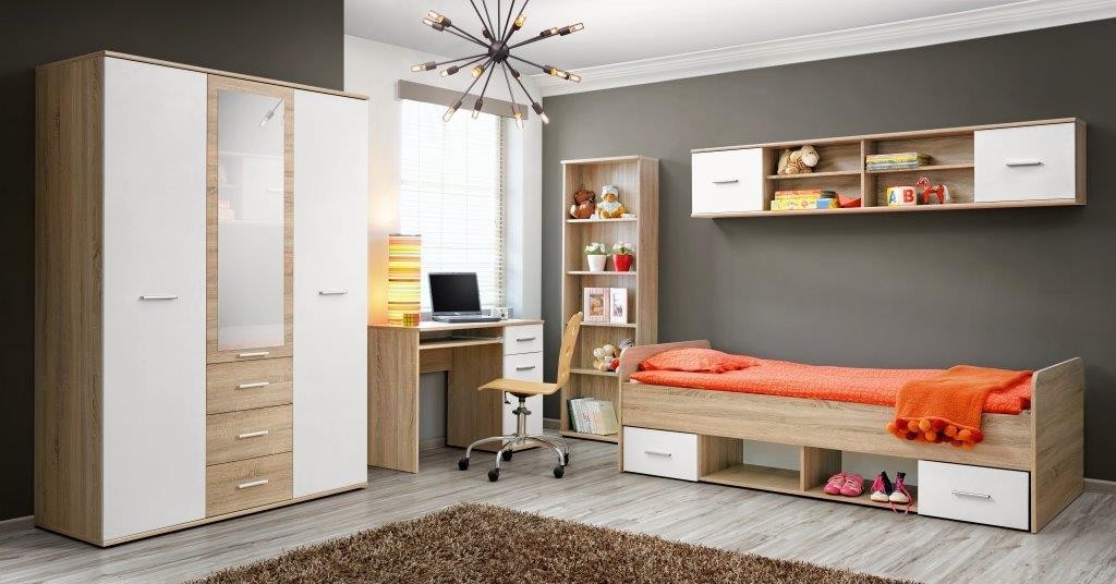 Zestaw młodzieżowy Dino IV to kompleksowe rozwiązanie do urządzenia pokoju młodzieżowego, łączące funkcjonalność z nowoczesnym designem. Kolorystyka dębu sonoma połączona z bielą wprowadza do pomieszczenia ciepło i jasność, tworząc przytulną i inspirującą przestrzeń do nauki, odpoczynku i zabawy. Szafa z trzema drzwiami oferuje przestronne miejsce do przechowywania, wyposażone w półki i szuflady oraz drążek na ubrania, co pozwala na łatwą organizację garderoby. Regał z półkami jest idealny na książki, podręczniki i dekoracje, natomiast szafka wisząca to dodatkowa przestrzeń na drobne przedmioty. Komfortowe łóżko zapewnia spokojny sen, a funkcjonalne biurko z miejscem na komputer, książki i materiały szkolne stanowi idealne miejsce do nauki i kreatywnej pracy.