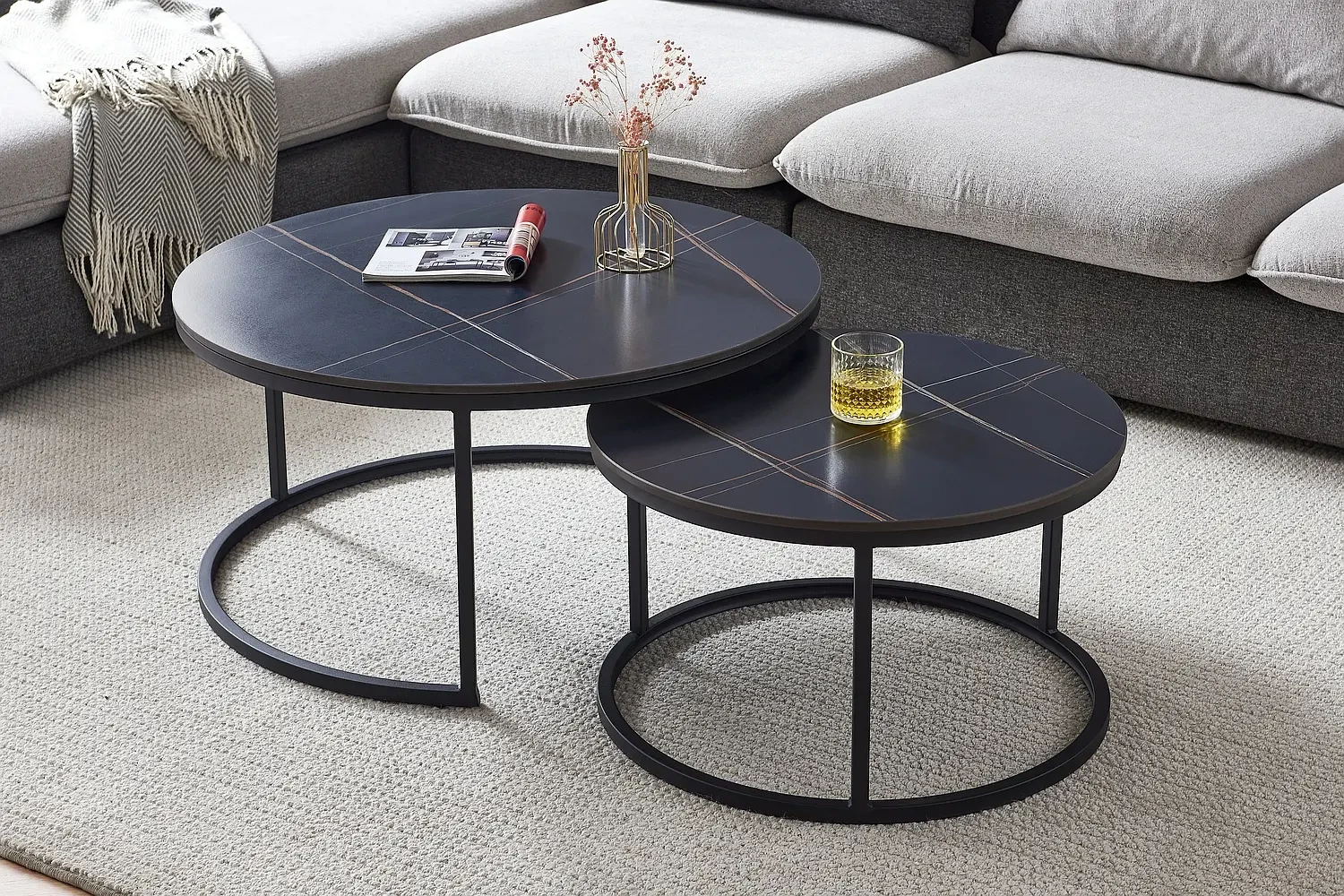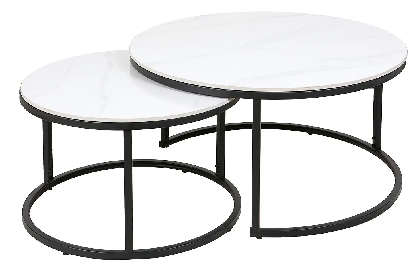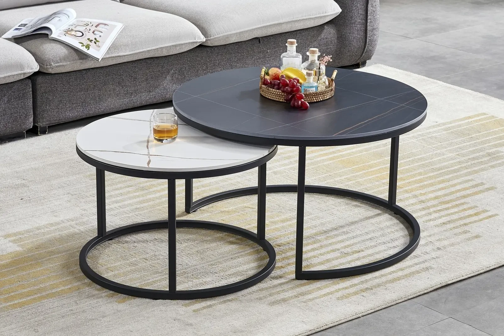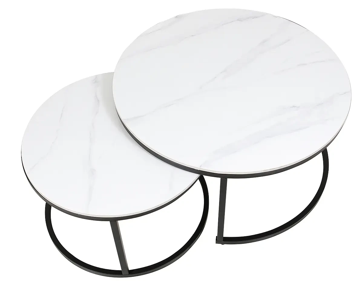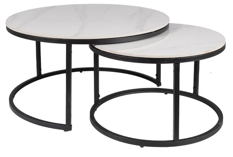 Zestaw stolików Ferrante C to klasyczna i ponadczasowa propozycja nowoczesnych mebli do salonu. Komplet składa się z dwóch okrągłych stolików o różnych wymiarach. Zarówno większy stolik o średnicy 80 cm, jak i mniejszy stolik o średnicy 60 cm prezentują się w kolorze matowej bieli. Dodatkowo, blaty zostały udekorowane modnym efektem marmuru. Blaty stolików Ferrante C wykonane zostały z wysokiej jakości ceramiki, która jest odporna na uderzenia i zmiany temperatury. Metalowe stelaże w kolorze czarnym zapewniają stabilność stolików. Ich prosty i minimalistyczny design sprawia, że zestaw stolików Ferrante C doskonale wkomponuje się zarówno w nowoczesne, jak i tradycyjne wnętrza.