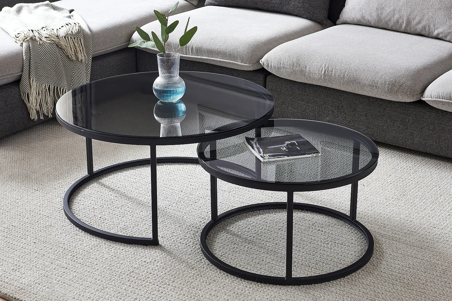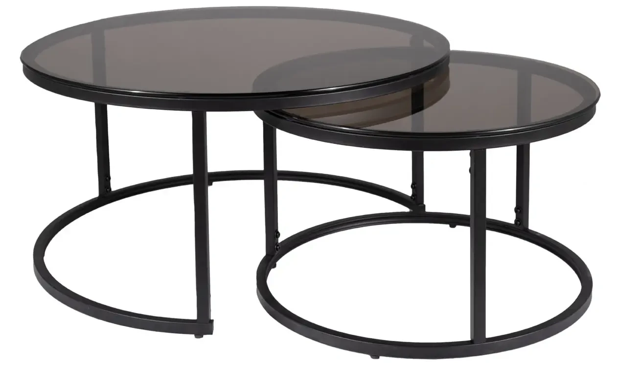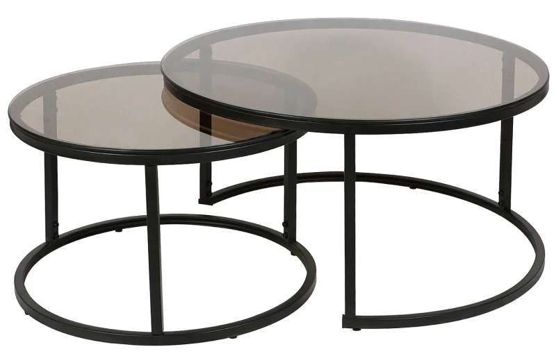 Zestaw stolików Ferrante E to klasyczna i ponadczasowa propozycja nowoczesnych mebli do salonu. Komplet składa się z dwóch okrągłych stolików o różnych wymiarach. Zarówno większy stolik o średnicy 80 cm, jak i mniejszy stolik o średnicy 60 cm prezentują się w szarym, transparentnym kolorze. Blaty stolików Ferrante E wykonane zostały z wysokiej jakości szkła hartowanego, które jest odporne na uderzenia i zmiany temperatury. Metalowe stelaże w kolorze czarnym zapewniają stabilność stolików. Ich prosty i minimalistyczny design sprawia, że zestaw stolików Ferrante E doskonale wkomponuje się zarówno w nowoczesne, jak i tradycyjne wnętrza.