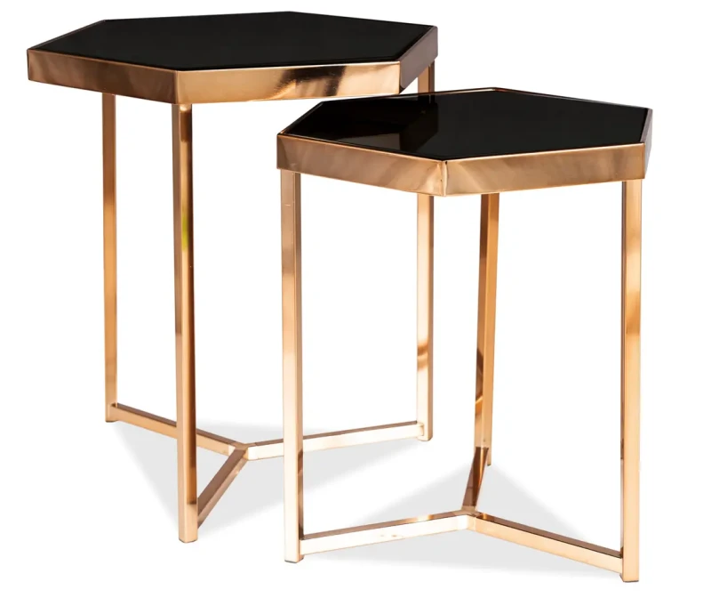 Zestaw stolików Milos to oryginalna i ponadczasowa propozycja nowoczesnych mebli do salonu. Komplet składa się z dwóch stolików o różnych wymiarach. Blaty stolików Milos wykonane zostały z wysokiej jakości szkła hartowanego w kolorze czarnym, które jest odporne na uderzenia oraz zmiany temperatur. Stabilność stolików zapewniają niebanalne metalowe stelaże wybarwione w kolorze szampańskim, co dodaje zestawowi wyjątkowego charakteru i nowoczesnego designu. Elegancki i minimalistyczny wygląd sprawia, że zestaw stolików Milos świetnie wkomponuje się do wnętrz nowoczesnych, jak również bardziej tradycyjnych.