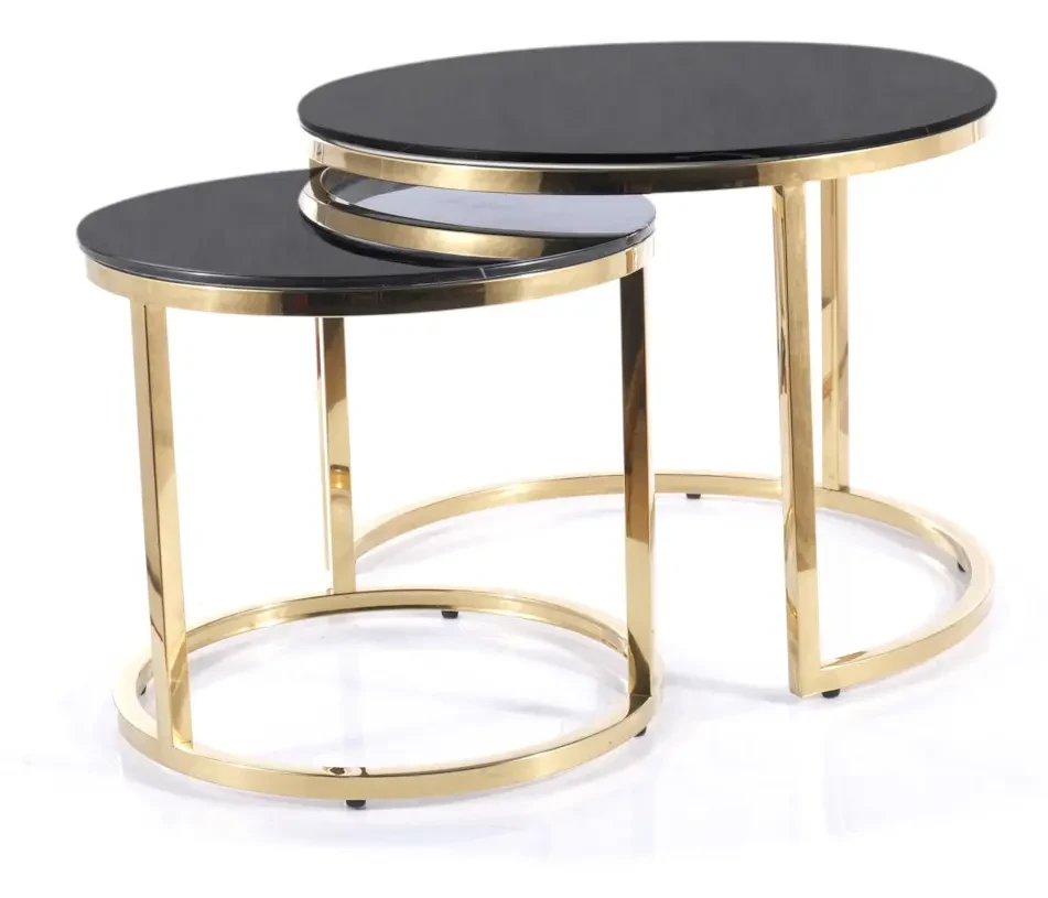 Zestaw stolików Muse II to elegancka i ponadczasowa propozycja nowoczesnych mebli do salonu. Komplet składa się z dwóch okrągłych stolików o różnych wymiarach. Blaty stolików Muse II wykonane zostały z wysokiej jakości szkła hartowanego, które jest odporne na uderzenia oraz zmiany temperatur. Ponadto charakteryzują się one zastosowanym efektem marmuru w odcieniach czerni, co dodaje zestawowi wyjątkowego charakteru i nowoczesnego designu. Stabilność stolików zapewniają niebanalne stelaże ze stali nierdzewnej, w pięknym złotym kolorze. Elegancki i minimalistyczny wygląd sprawia, że zestaw stolików Muse II świetnie wkomponuje się do wnętrz nowoczesnych, jak również bardziej tradycyjnych.