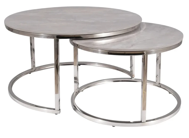 Zestaw stolików Portafino B to klasyczna i ponadczasowa propozycja nowoczesnych mebli do salonu. Komplet składa się z dwóch okrągłych stolików o różnych wymiarach. Blaty stolików Portafino B zostały precyzyjnie wykonane z wysokiej jakości ceramiki. Ponadto charakteryzują się one zastosowanym efektem marmuru w odcieniach szarości, co dodaje zestawowi wyjątkowego charakteru i nowoczesnego designu. Niebanalne stelaże ze stali nierdzewnej zapewniają stabilność stolików. Prosty i minimalistyczny wygląd sprawia, że zestaw stolików Portafino B doskonale wkomponuje się zarówno w nowoczesne, jak i bardziej tradycyjne wnętrza.