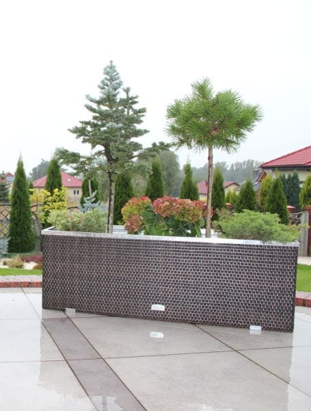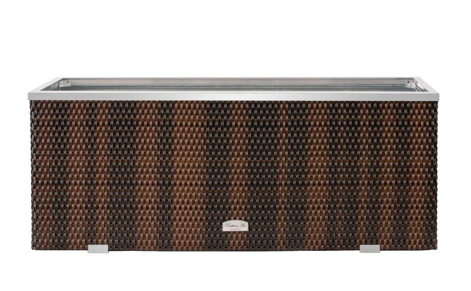 Donica została wykonana z wysokiej jakości plecionego technorattanu. Góra wykończona z aluminium polerowanego, natomiast boki zostały wzbogacone o dwie ozdobne listwy. Wnętrze donicy technorattanowej wykończone zostało blachą ocynkowaną co umożliwia bezpośrednie wypełnienie podłożem pod rośliny, na dnie donicy są otwory które pozwolą na swobodny odpływ wody.