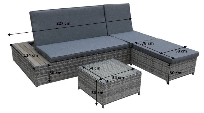 - poduszki w kolorze szarym na siedziska i oparcia w cenie zestawu (3 szt. na siedziska, 3 szt. na oparcia)