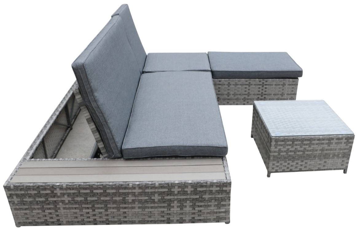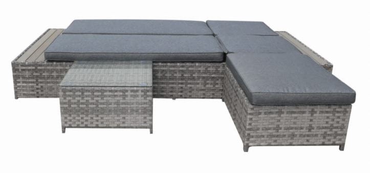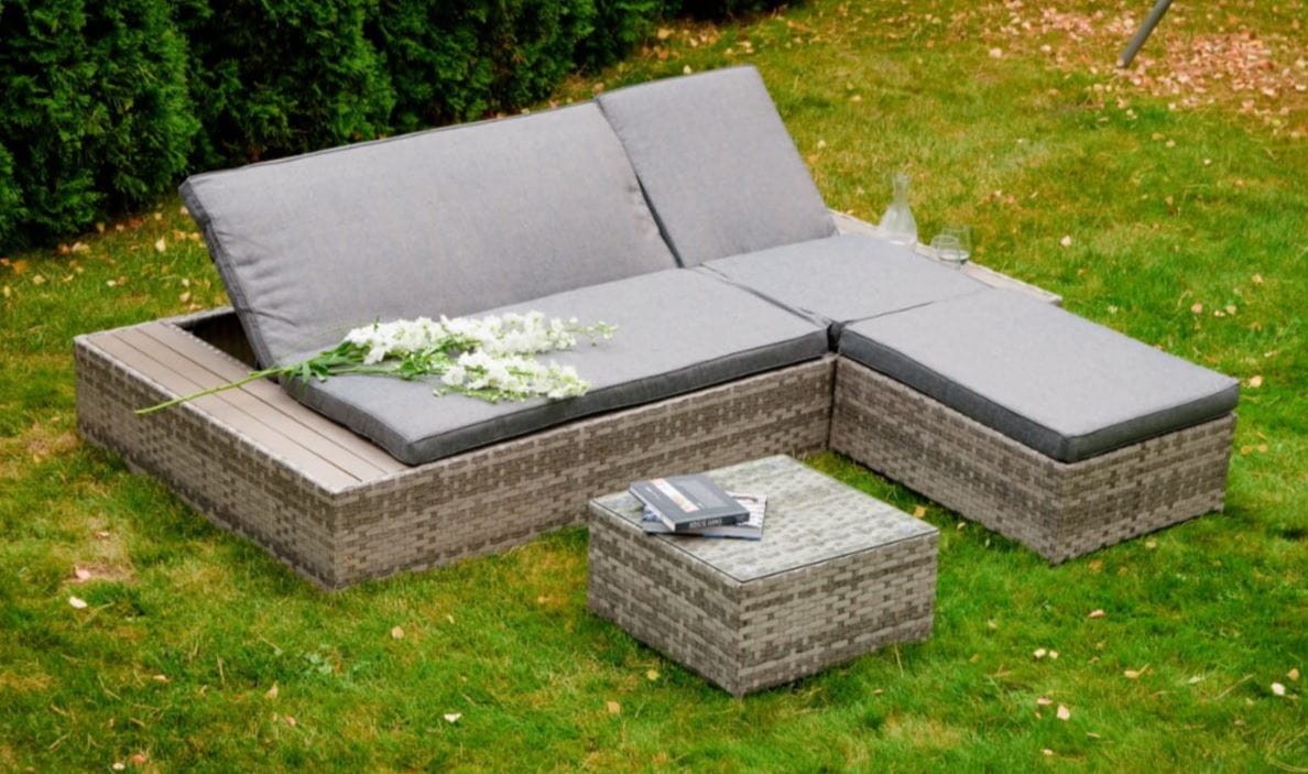 Ekskluzywne łóżko ogrodowe Delilah z pufą i stolikiem technorattanu szary melanż