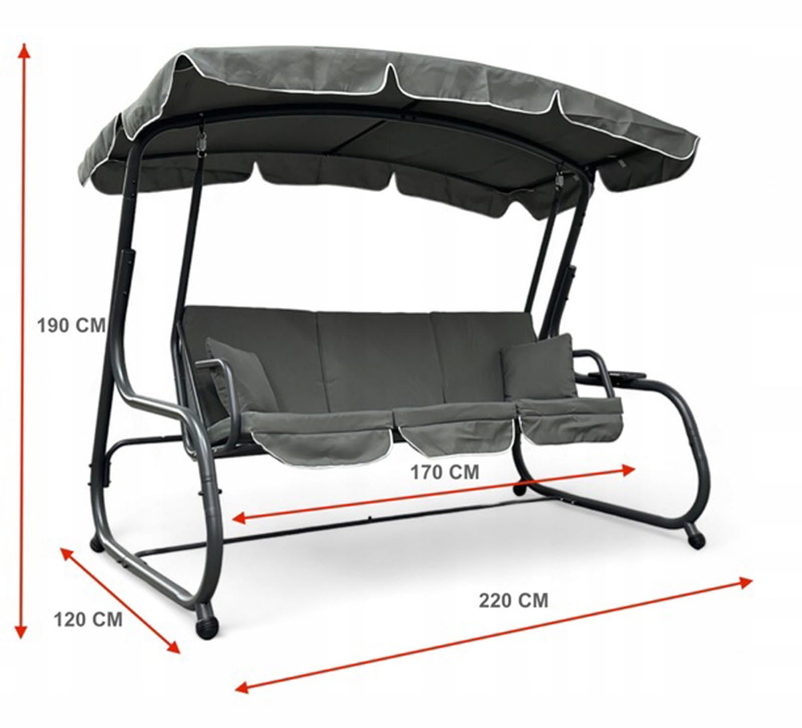 Huśtawka ogrodowa wolnostojąca Ragabas XXL to solidnie wykonana huśtawka z metalowym stelażem zapewnia stabilność i bezpieczeństwo. Oferuje regulowany daszek, który można dostosować do ochrony przed słońcem lub deszczem, co jest szczególnie przydatne przy zmiennej pogodzie. Huśtawka posiada zdejmowane poduszki na siedziskach, co ułatwia czyszczenie i konserwację. Jest idealna do odpoczynku w ogrodzie, zapewniając komfort i funkcjonalność. Dodatkowe udogodnienia to m.in. podstawka na napoje oraz możliwość regulacji kąta nachylenia daszku w zakresie 45 stopni, co umożliwia optymalne ustawienie osłony przeciwsłonecznej. Każda metalowa noga wykończona został zaślepkami z tworzywa, dzięki czemu ma na celu minimalizowanie ryzyka kontuzji. To rozwiązanie sprawia, że jest to bezpieczna opcja zarówno dla dzieci, jak i osób starszych. Wymiary stelaża to 220 cm długości, 120 cm szerokości, a wysokość całkowita wynosi 190 cm. Od tej pory to będzie Twoje ulubione miejsce do relaksu.
