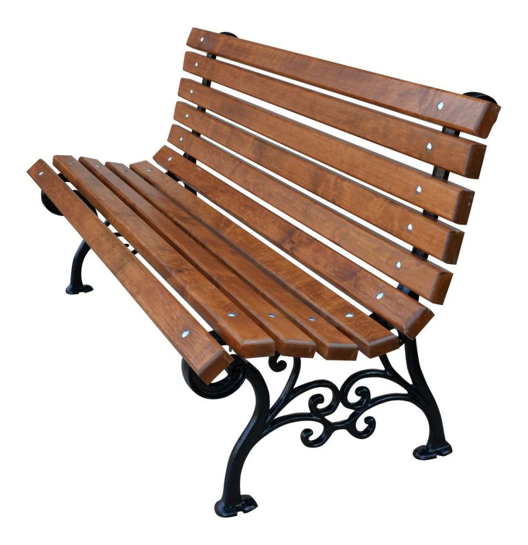 Ławka klasyczna parkowa. Wykonana na żeliwnych stelażach formowanych maszynowo. Stelaże pomalowane proszkowo, co skutecznie zabezpiecza przed korozją. Nogi ławki posiadają otwory, dzięki którym jest możliwość przymocowania ławki do podłoża. Deski wykonane z drewna olchowego, impregnowanego i lakierowanego na kolor bursztynowo-złoty.