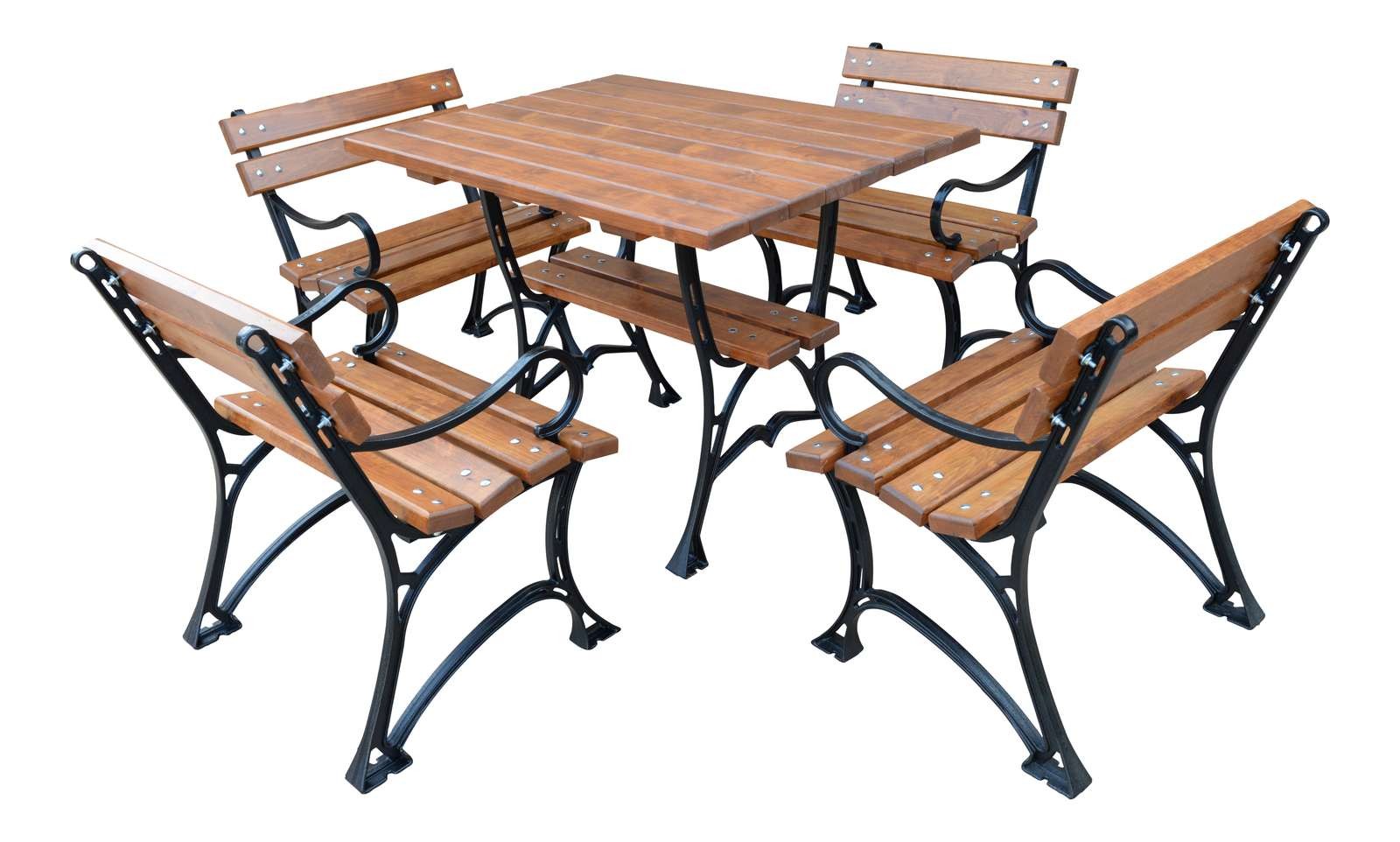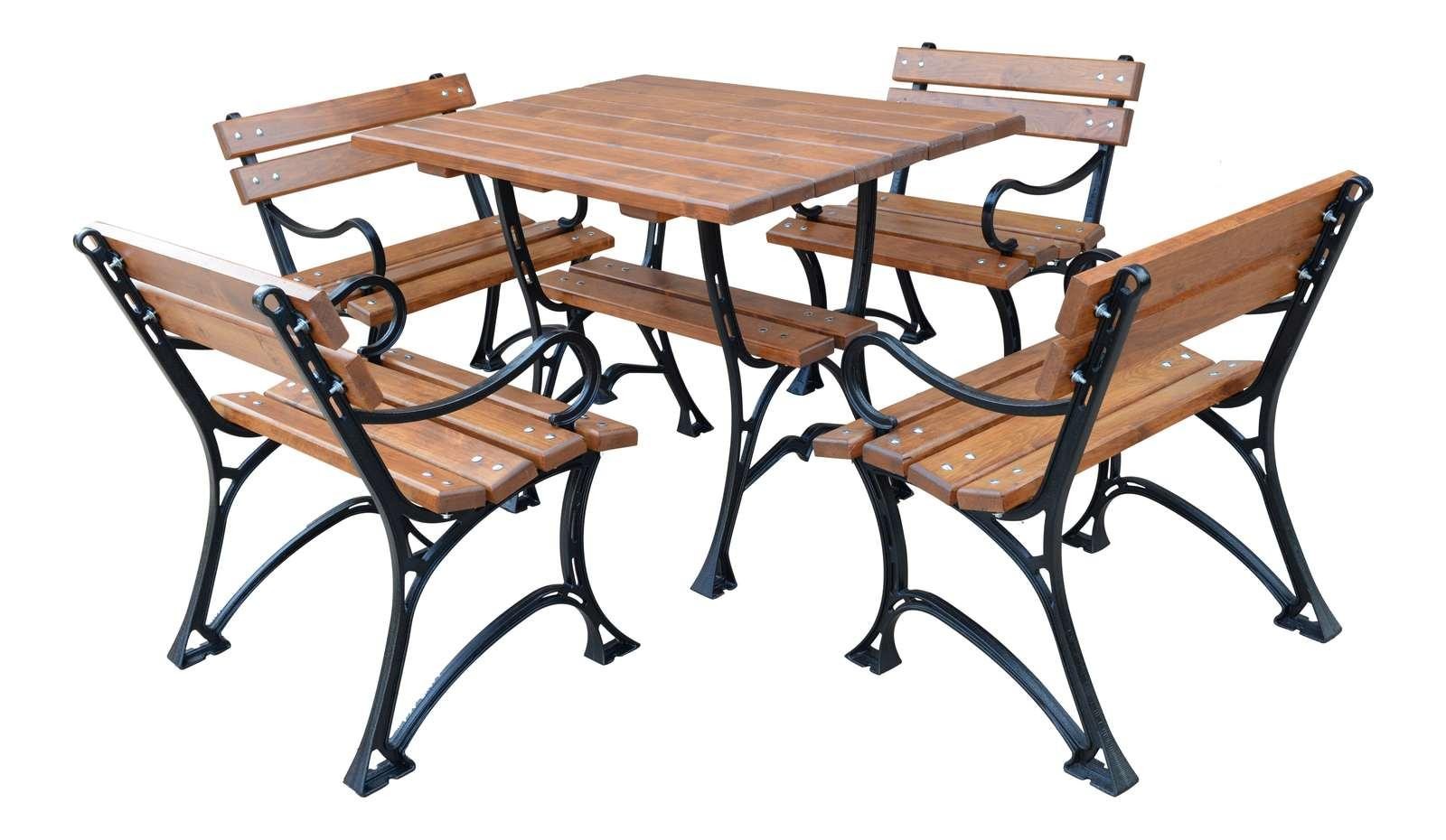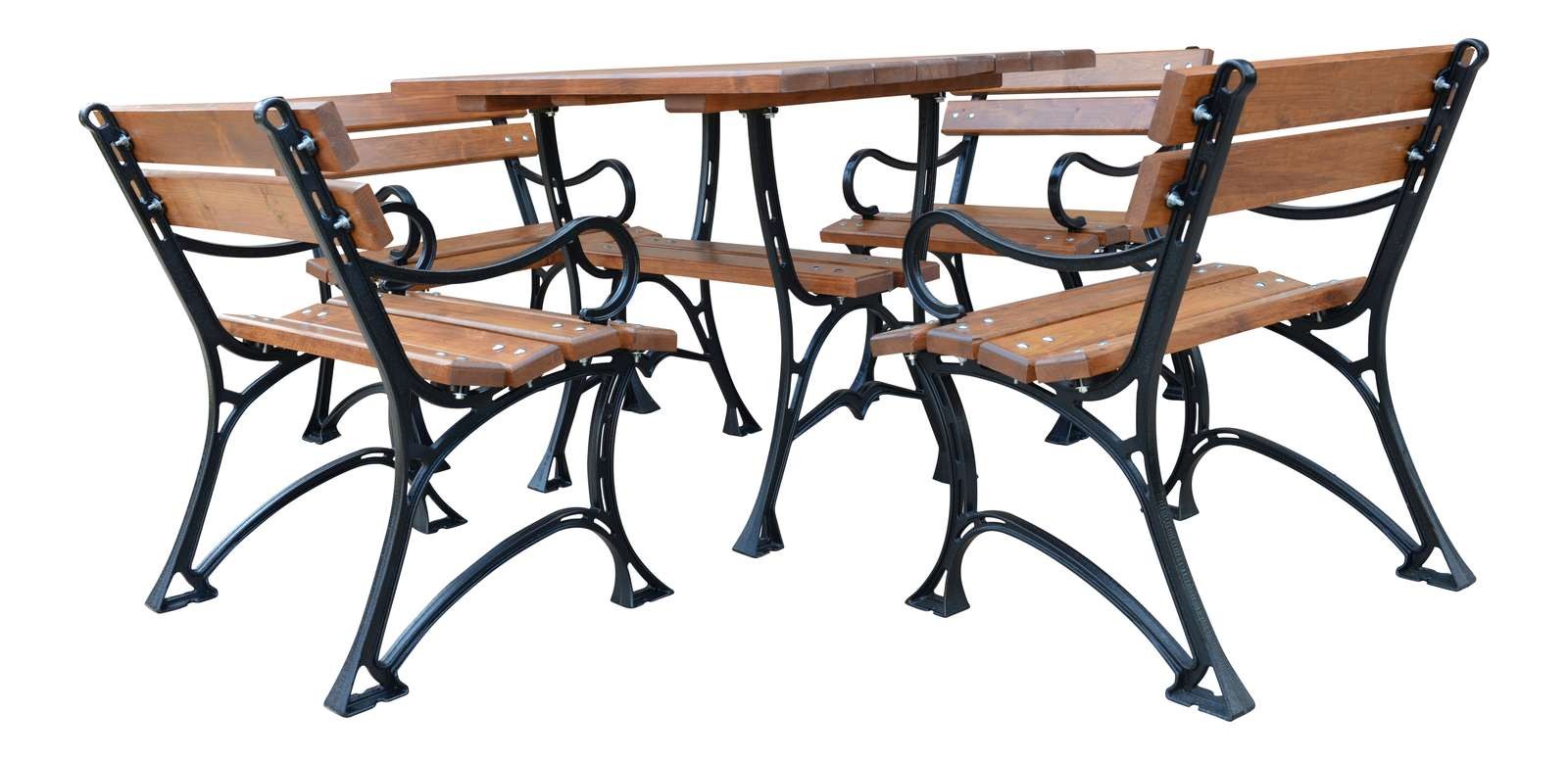 Zestaw mebli ogrodowych Faktor, idealnie sprawdzi się w przydomowym ogrodzie, jak również w przestrzeni publicznej czy ogródku restauracyjnym. Dzięki jego stabilnej konstrukcji nie zawiedzie przez wiele lat. Zestaw składa się ze stołu i 4 fotelików z podłokietnikami. Foteliki i stół Wykonane na żeliwnych stelażach formowanych maszynowo. Stelaże pomalowane proszkowo, co skutecznie zabezpiecza przed korozją. Nogi ławki posiadają otwory, dzięki którym jest możliwość przymocowania ławki do podłoża. Deski wykonane z drewna olchowego, pomalowane impregnatem zabezpieczającym deskę przed grzybem i robakiem. Dodatkowo dwukrotnie pomalowane lakierem na kolor bursztynowo-złoty.