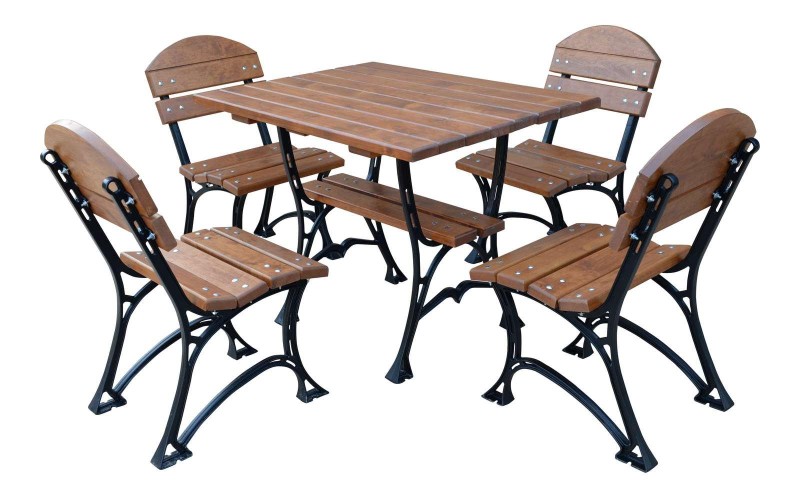 Zestaw mebli ogrodowych Faktor, idealnie sprawdzi się w przydomowym ogrodzie, jak również w przestrzeni publicznej czy ogródku restauracyjnym. Dzięki jego stabilnej konstrukcji nie zawiedzie przez wiele lat. Zestaw składa się ze stołu i 4 foteli bez podłokietnika. Foteliki i stół wykonane na żeliwnych stelażach formowanych maszynowo. Stelaże pomalowane proszkowo, co skutecznie zabezpiecza przed korozją. Nogi ławki posiadają otwory, dzięki którym jest możliwość przymocowania ławki do podłoża. Deski wykonane z drewna olchowego, pomalowane impregnatem zabezpieczającym deskę przed grzybem i robakiem. Dodatkowo dwukrotnie pomalowane lakierem na kolor bursztynowo-złoty.