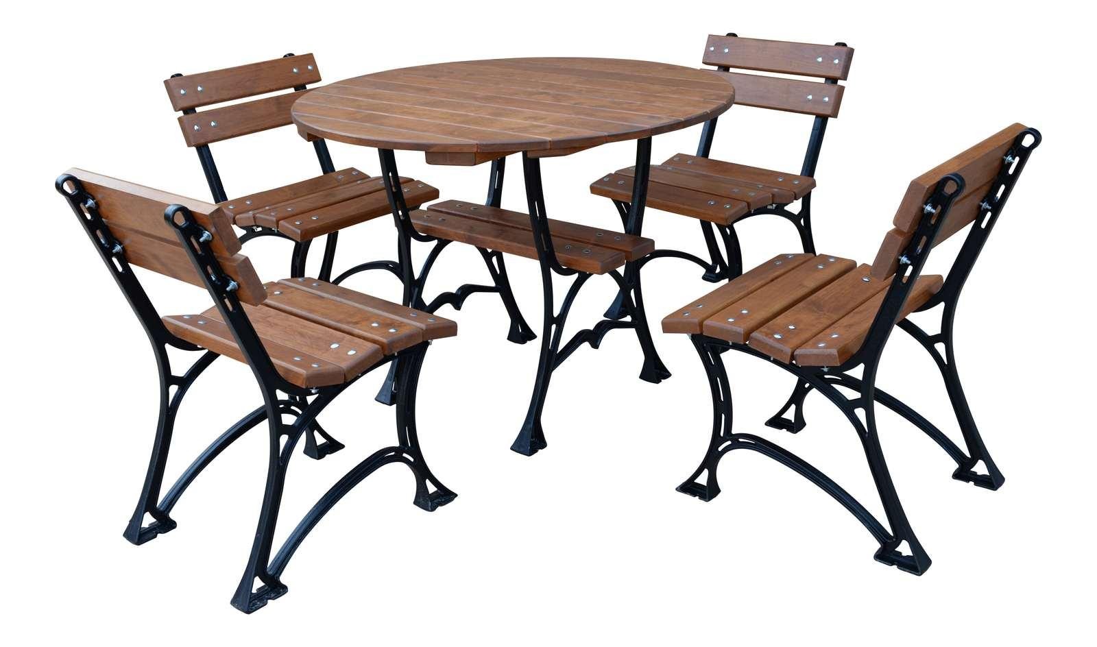 Zestaw mebli ogrodowych Restor, idealnie sprawdzi się w przydomowym ogrodzie, jak również w przestrzeni publicznej czy ogródku restauracyjnym. Dzięki jego stabilnej konstrukcji nie zawiedzie przez wiele lat. Zestaw Restor zawiera: stół okrągły z czterema fotelami. Wykonane na żeliwnych stelażach formowanych maszynowo. Stelaże pomalowane proszkowo, co skutecznie zabezpiecza przed korozją. Nogi ławki posiadają otwory, dzięki którym jest możliwość przymocowania ławki do podłoża. Deski wykonane z drewna olchowego, pomalowane impregnatem zabezpieczającym deskę przed grzybem i robakiem. Dodatkowo dwukrotnie pomalowane lakierem na kolor bursztynowo-złoty.