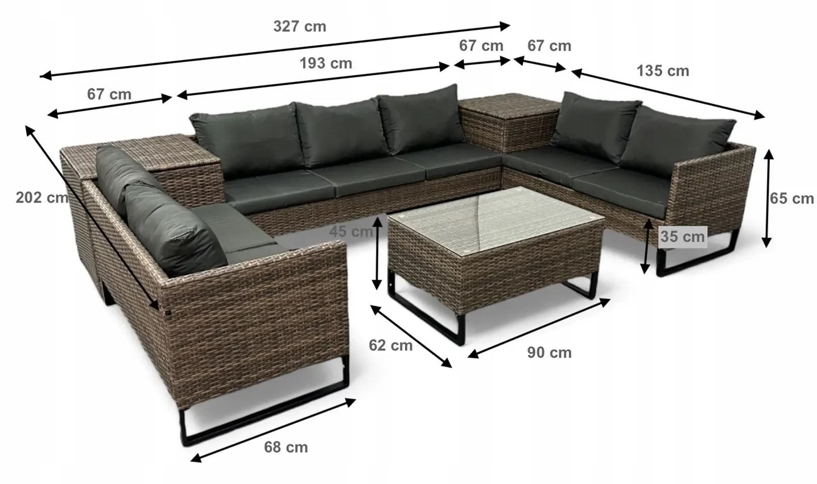 - Schowek na poduszki: 67 cm x 67 cm