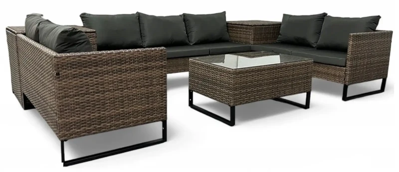 Mega komfortowy dwustronny narożnik Big w kształcie litery "U" z technorattanu wyposażony w miękkie poduchy jest stworzony do relaksu. Pomieści wszystkich gości i zapewni im wygodę nawet podczas dłuższego odpoczynku. A jeśli planujesz chwilę dla siebie stolik ze szklanym blatem pomieści książki, czasopisma i pyszną kawę, czyli wszystko to co do relaksu niezbędne. Świetnie sprawdzi się na dużym tarasie i będzie stanowił wspaniałą bazę do urządzenia wymarzonego kącika do relaksu.