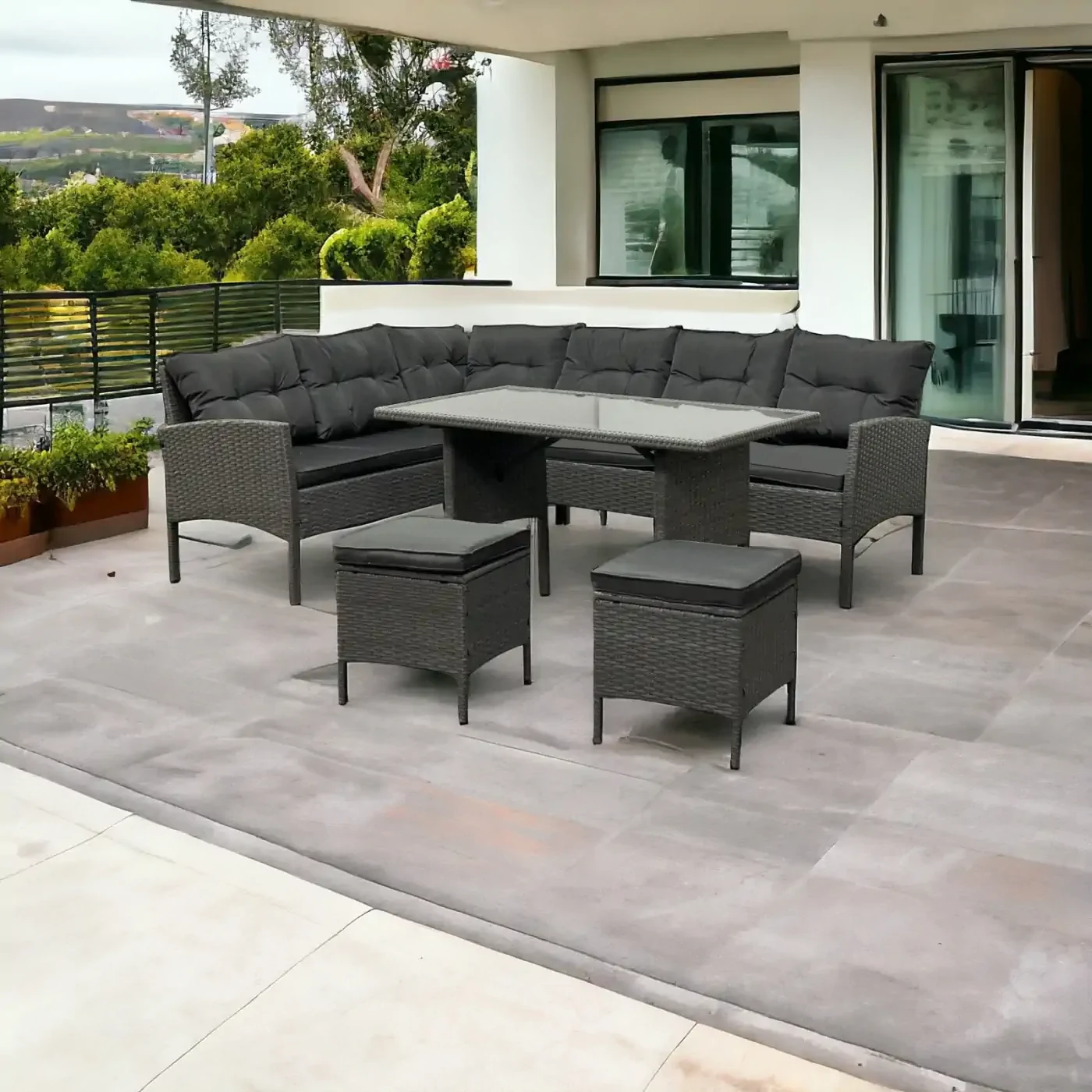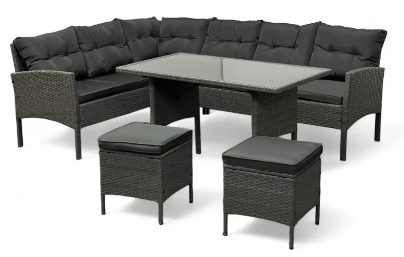 Narożnik z technorattanu Puerto BIG to propozycja dla dużych rodzin lub otwartych domów, gdzie przyjmuje się dużo gości. Można go zestawiać tak w konfiguracji jadalnianej jak wypoczynkowej dla jak największej wygody użytkowania. Uniwersalny fason oraz odporny na warunki atmosferyczne technorattan gwarantuje, że zestaw będzie latami cieszył oko tak Ciebie jak Twoją rodzinę i gości. Wygodny narożnik, stół z blatem z hartowanego szkła oraz dwie pufy uzupełniają ten komplet. Z tym zestawem stworzenie strefy komfortu to pestka. Miękkie i puszyste poduszki i siedziska sprawią, że niechętnie będziesz ją opuszczać.