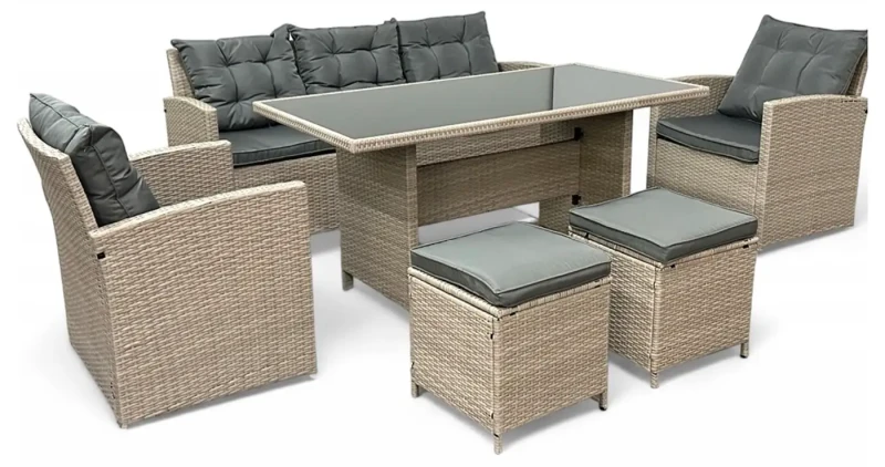 Zestaw mebli z technorattanu Maxipolo to propozycja dla dużych rodzin lub otwartych domów, gdzie przyjmuje się dużo gości. Można go zestawiać tak w konfiguracji jadalnianej jak wypoczynkowej dla jak największej wygody użytkowania. Uniwersalny fason oraz odporny na warunki atmosferyczne technorattan gwarantuje, że zestaw będzie latami cieszył oko tak Ciebie jak Twoją rodzinę i gości. Wygodna 3 osobowa sofa i dwa fotele uzupełniają dwie pufy oraz stolik z blatem z hartowanego szkła. Z tym zestawem stworzenie strefy komfortu to pestka. Miękkie i puszyste poduszki i siedziska sprawią, że niechętnie będziesz ją opuszczać.