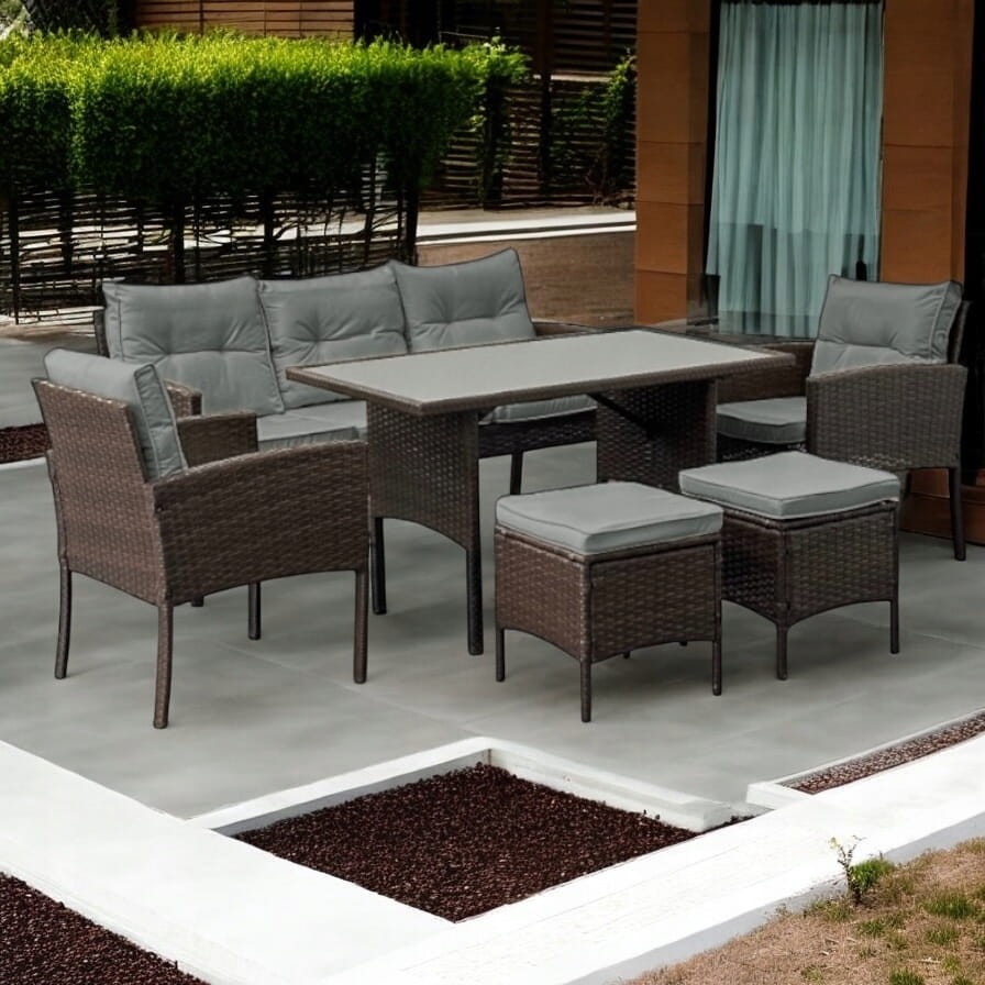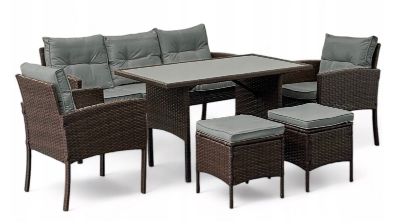 Zestaw mebli z technorattanu Puerto to propozycja dla dużych rodzin lub otwartych domów, gdzie przyjmuje się dużo gości. Można go zestawiać tak w konfiguracji jadalnianej jak wypoczynkowej dla jak największej wygody użytkowania. Uniwersalny fason oraz odporny na warunki atmosferyczne technorattan gwarantuje, że zestaw będzie latami cieszył oko tak Ciebie jak Twoją rodzinę i gości. Wygodna 3 osobowa sofa i dwa fotele uzupełniają dwie pufy oraz stolik z blatem z hartowanego szkła. Z tym zestawem stworzenie strefy komfortu to pestka. Miękkie i puszyste poduszki i siedziska sprawią, że niechętnie będziesz ją opuszczać.