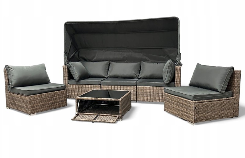 Zestaw ogrodowy wielofunkcyjny Elitar leżanka narożnik + stolik ze schowkiem to propozycja dla dużych rodzin lub otwartych domów, gdzie przyjmuje się dużo gości. Można go zestawiać tak w konfiguracji jadalnianej jak wypoczynkowej dla jak największej wygody użytkowania. Uniwersalny fason oraz odporny na warunki atmosferyczne technorattan gwarantuje, że zestaw będzie latami cieszył oko swoim dobrym stanem. Wygodna sofa, która bez problemu może zamienić się w narożnik w zestawie posiada jeszcze stolik z blatem z hartowanego szkła oraz specjalnym schowkiem. Z tym zestawem stworzenie strefy komfortu to pestka. Miękkie, puszyste regulowane poduszki i wygodne siedziska sprawią, że niechętnie będziesz ją opuszczać.