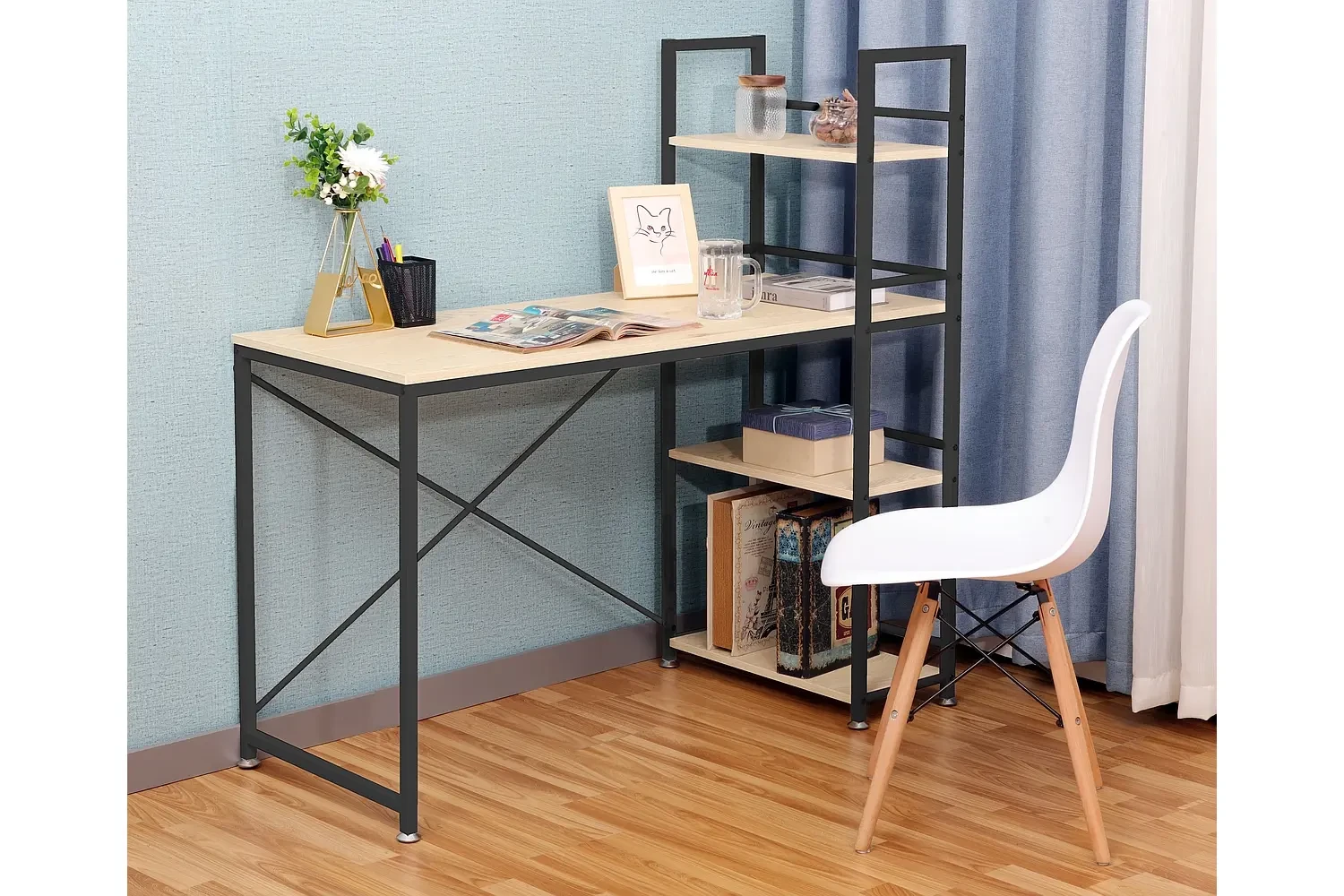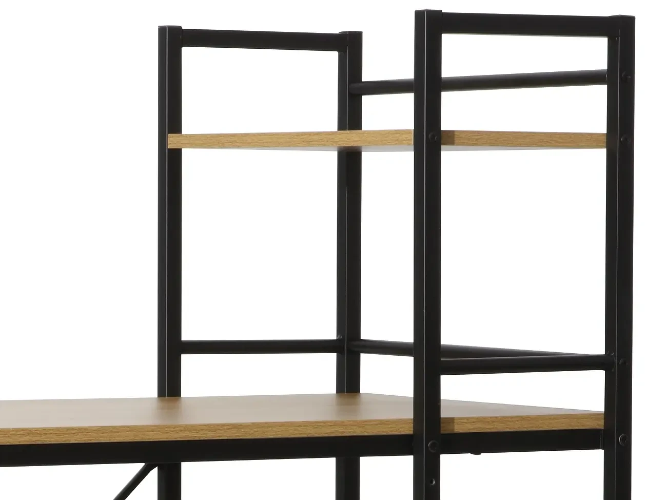 Biurko B-036 to oryginalny model, który idealnie wpisze się w stylistykę wnętrz nowoczesnych oraz tradycyjnych. Mebel wykonany został z wysokiej jakości płyty laminowanej w kolorze dębu, gwarantując stabilność i długotrwałe użytkowanie. Metalowy korpus biurka wybarwiony jest w czarnym, matowym kolorze. Mebel charakteryzuje się niezwykłą funkcjonalnością, gdyż posiada trzy półki, dzięki którym postawimy na nim wszystkie niezbędne książki, dokumenty oraz inne drobiazgi. Biurko B-036 doskonale sprawdzi się w przestrzeni biurowej lub pokoju młodzieżowym, tam gdzie stworzy idealne miejsce do pracy lub nauki.