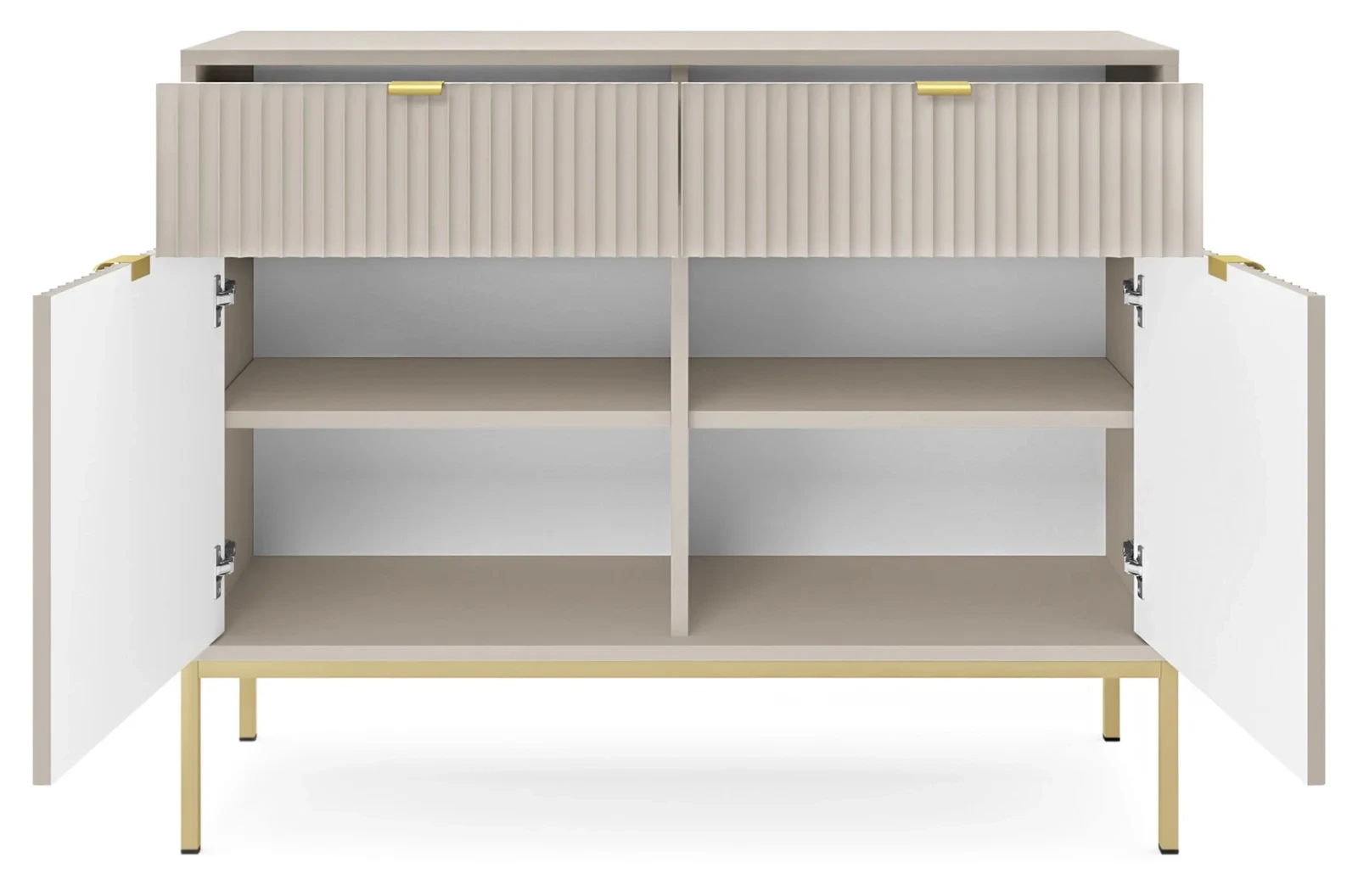 - kolor komody: korpus i fronty: kaszmir; uchwyty: złote; stelaż: złoty