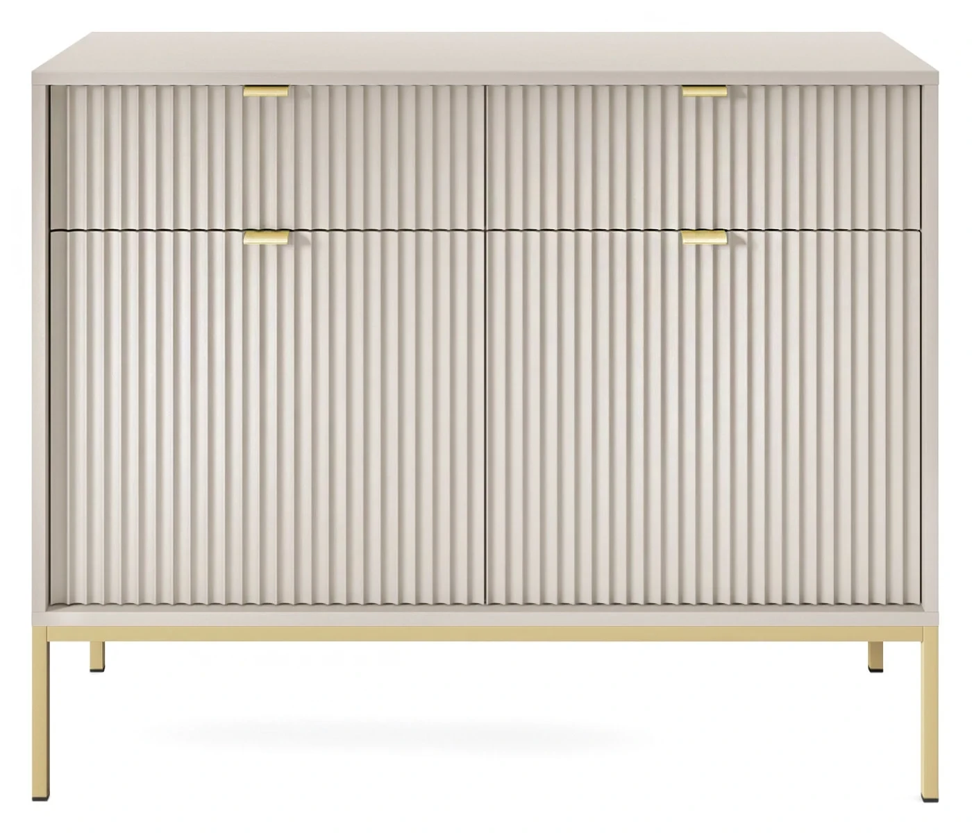 Komoda Nova to pojemny i nowoczesny mebel. Komoda została wyposażona w pojemne półki i szuflady, dzięki czemu stanowi idealne miejsce do przechowywania ubrań oraz pozostałych elementów garderoby, takich jak czapki, szale itp. Komoda sprawdzi się zarówno w salonie, sypialni, jak też pokoju młodzieżowym czy przedpokoju. Nowoczesny, minimalistyczny design połączony z delikatnym kaszmirowym kolorem sprawia, że komoda Nova prezentuje się niezwykle stylowo i nowocześnie. Prosta ale elegancka forma z dekoracyjnym ryflowaniem na frontach to must have dla miłośników nowoczesnego designu. Metalowa podstawa nadaje lekkości konstrukcji a całości dopełniają ozdobne uchwyty w kolorze złotym. Mebel został zaprojektowany i wykonany w Polsce co jest gwarancją jakości - Wspieraj