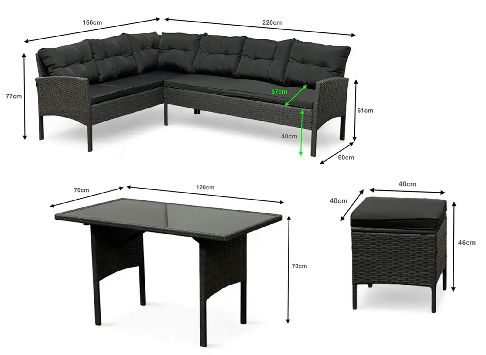 - Głębokość siedziska: 57 cm