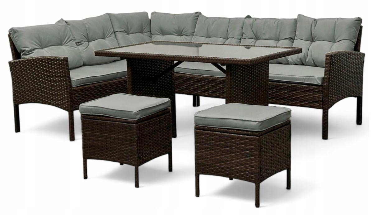 Narożnik ogrodowy z technorattanu Puerto BIG + stolik i 2x pufy Brąz + Szare poduszki