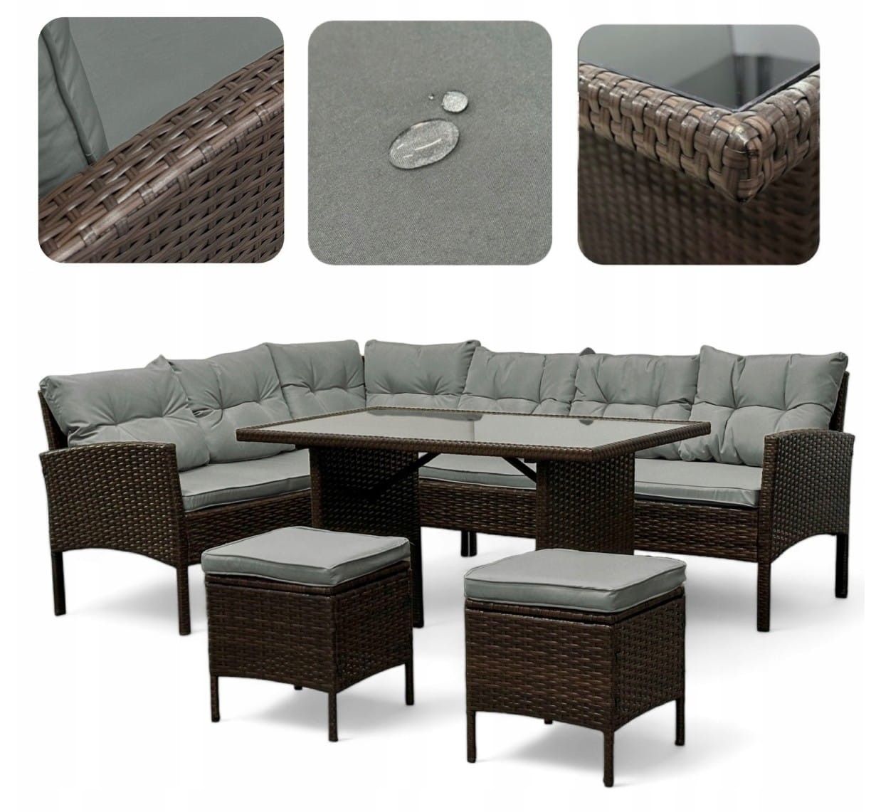 Co wyróżnia Narożnik z technorattanu Puerto BIG + stolik i 2x pufy Brąz + Szare poduszki: