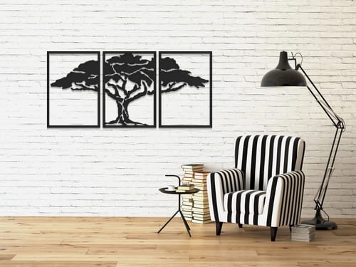 Dekoracja ścienna drzewo to trzy symetryczne obrazy tworzące designerską dekorację ze stali pokryta strukturalną powłoką w kolorze czarnego matu. Idealnie dopełni wnętrze każdego salonu, tworząc zwartą kompozycję. Magia trzyczęściowego obrazu leży w jego potencjale. Od Ciebie zależy, jak zawisną poszczególne części i jak wiele światła pozostanie między nimi.