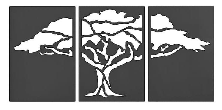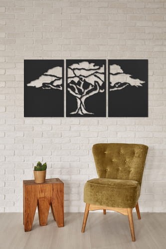 Dekoracja ścienna drzewo to trzy symetryczne obrazy tworzące designerską dekorację ze stali pokryta strukturalną powłoką w kolorze czarnego matu. Idealnie dopełni wnętrze każdego salonu, tworząc zwartą kompozycję. Magia trzyczęściowego obrazu leży w jego potencjale. Od Ciebie zależy, jak zawisną poszczególne części i jak wiele światła pozostanie między nimi.